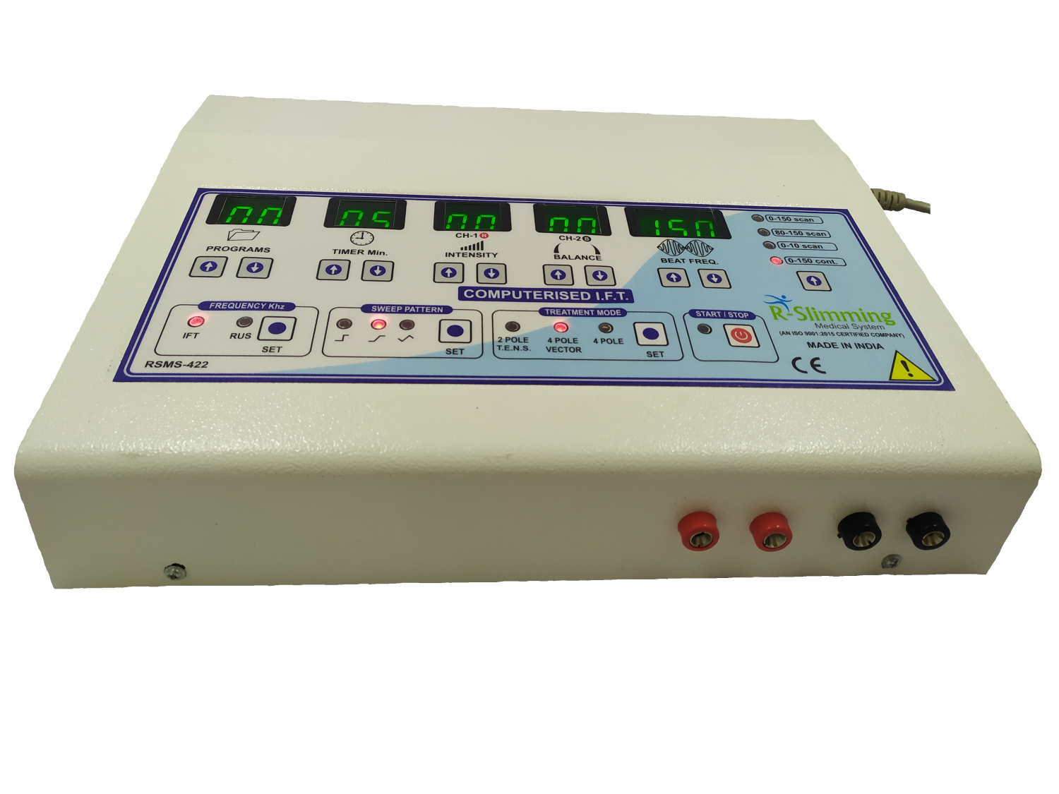 The RSMS-422 is an advanced and trend setting interferential therapy equipment from R-Slimming Medical System. During the development simplicity of operation and patient safety were the principle consideration. All the setting parameters are clearly displayed on a LCD screen. The corresponding parameters are easily set with Soft touch keys. Digital intensity control helps for smooth and error free operations.