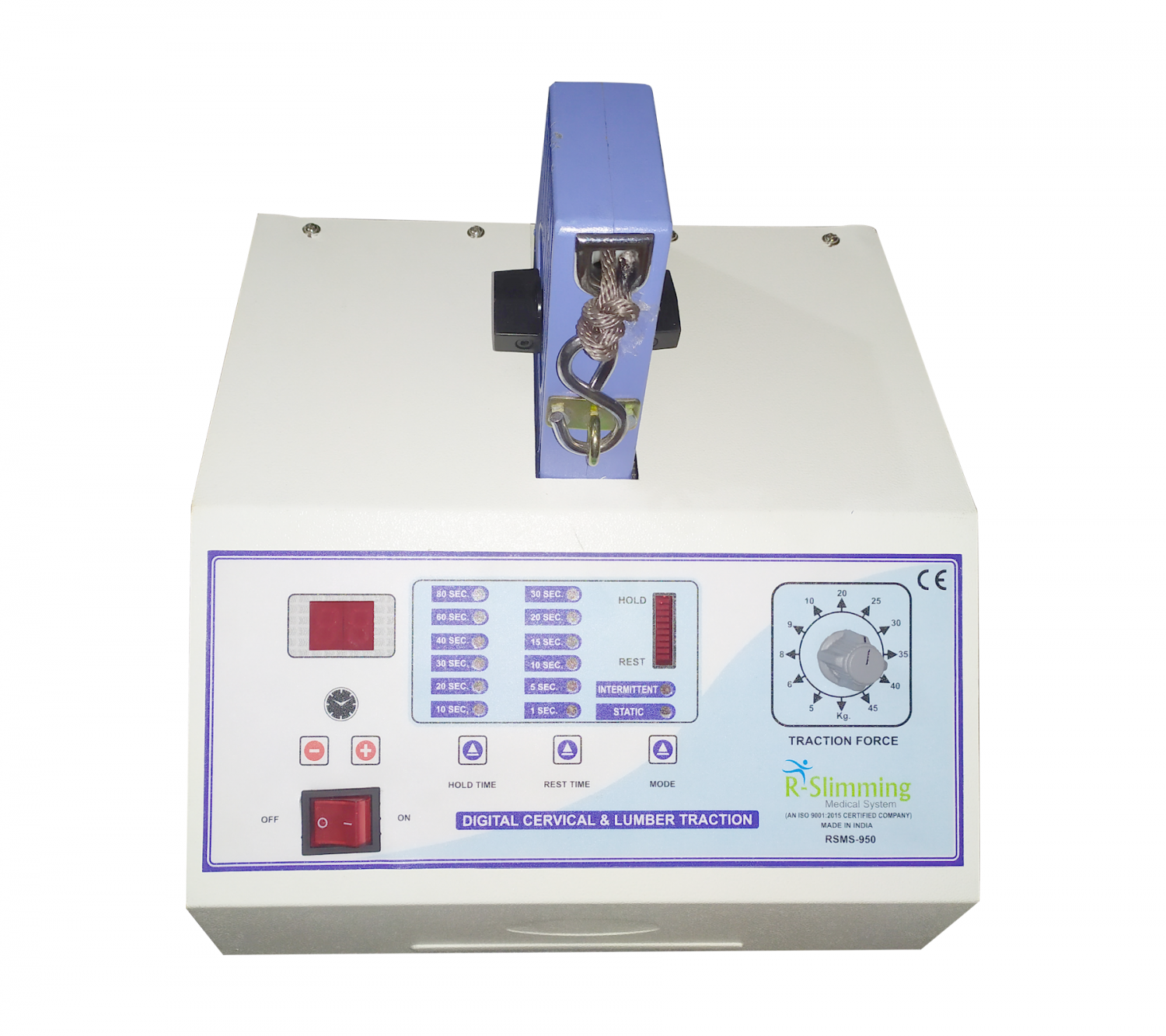 RSMS-950 can pull load of 5-45 Kgs. Thanks to solid moulded aluminum gear box assembly and high power sturdy motor. The treatment time is electronically controlled and displayed digitally. At the end of treatment time the alarm comes up, traction stops automatically and releases the patient.