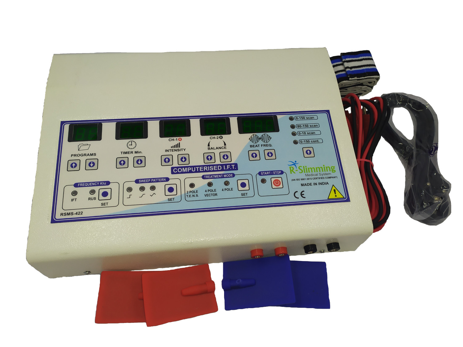 The RSMS-422 is an advanced and trend setting interferential therapy equipment from R-Slimming Medical System. During the development simplicity of operation and patient safety were the principle consideration. All the setting parameters are clearly displayed on a LCD screen. The corresponding parameters are easily set with Soft touch keys. Digital intensity control helps for smooth and error free operations.