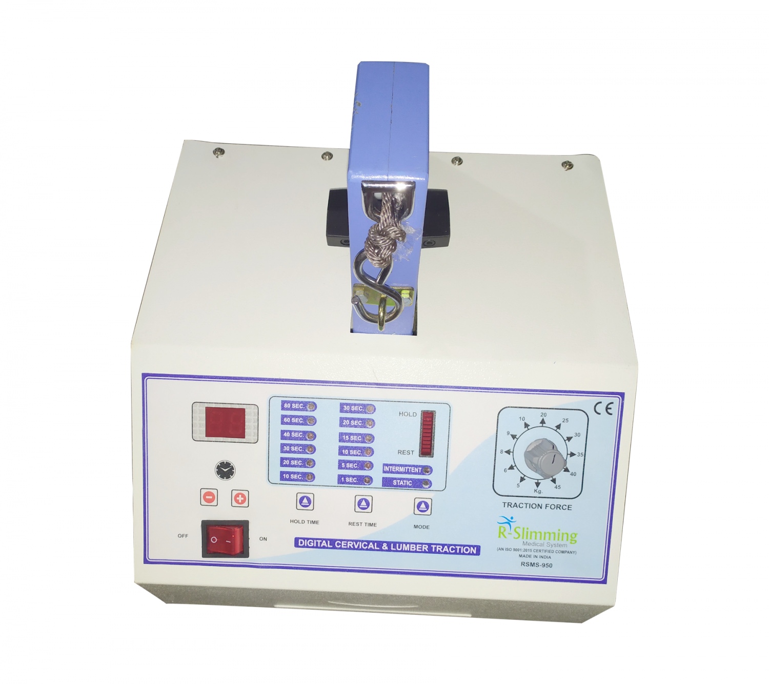 RSMS-950 can pull load of 5-45 Kgs. Thanks to solid moulded aluminum gear box assembly and high power sturdy motor. The treatment time is electronically controlled and displayed digitally. At the end of treatment time the alarm comes up, traction stops automatically and releases the patient.